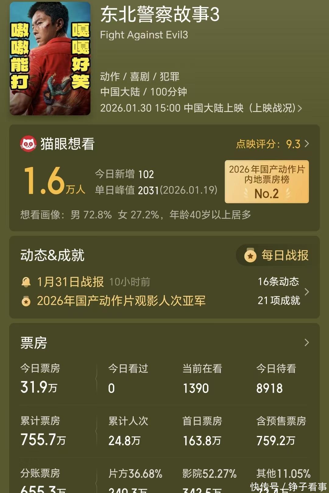 其实,本周末一起上新的一大堆片子,日子都不好过。不管是杰森·斯坦森的《庇护之地》,还是杰拉德·巴特勒的《末日逃生2》,全都在《疯狂动物城2》的阴影下扑街了。唯一有点水花的,反倒是四十多年前的老古董——库布里克的《闪灵》。这部经典重映,三天也拿下了1400多万,虽然没拿到日冠,但至少比《东北警察故事3》体面多了。 说到底,谢苗这次步子可能迈得太大了。他之前在网络电影圈打得风生水起,《目中无人》和前两部《东北警察故事》口碑都不错,积累了扎实的观众缘。可一上来就硬刚院线,偏偏又撞上朱迪和尼克这对“票房永动机”,那可不就是自讨苦吃嘛。要是老老实实在线上播,说不定又是几千万分账到手,何苦来院线遭这份罪?这下好了,不仅钱打了水漂,连“一线动作巨星”的梦都碎了一地。