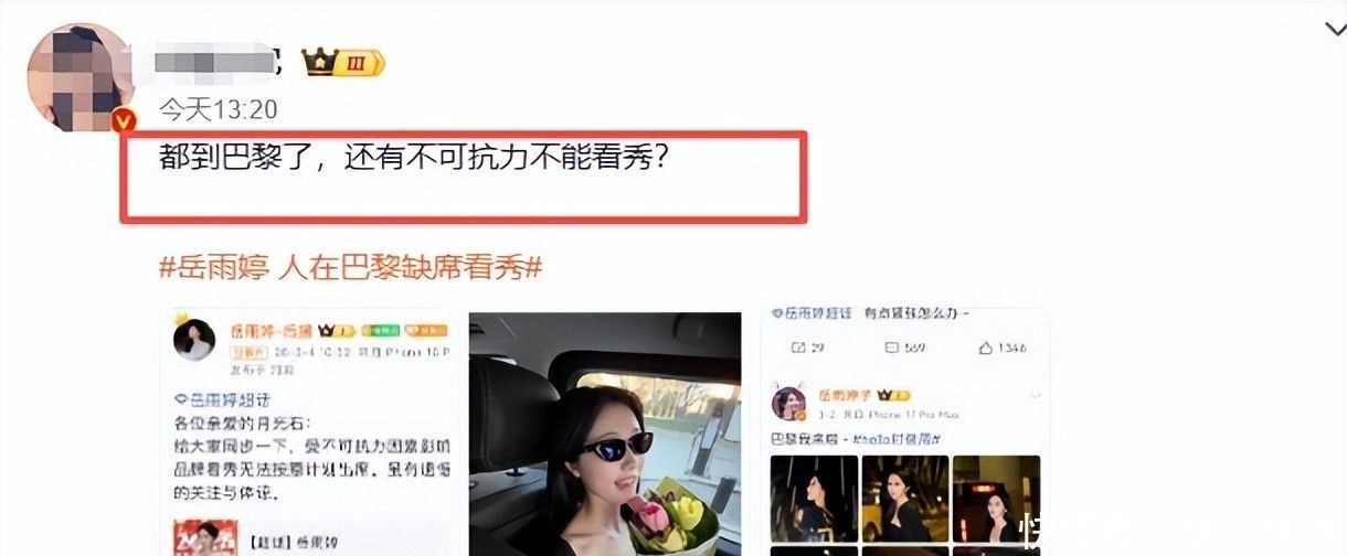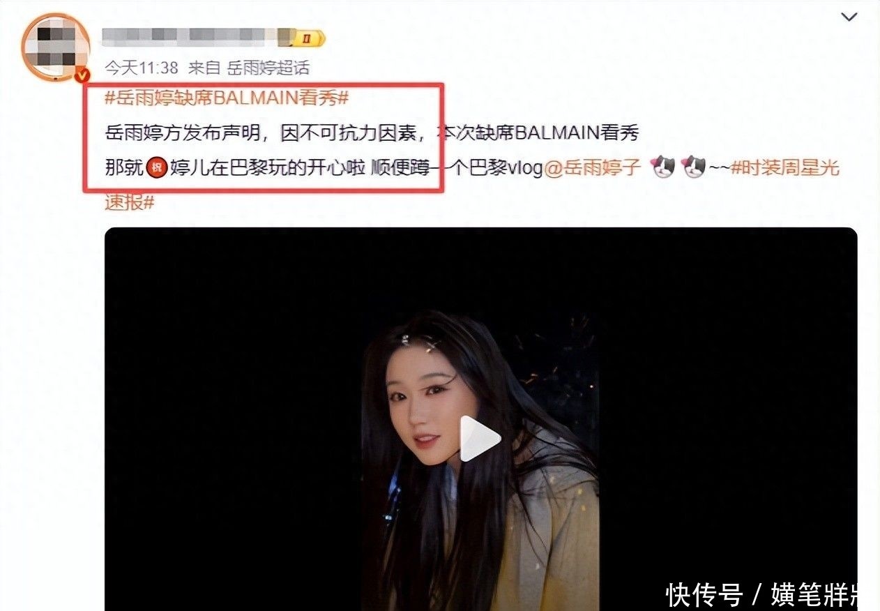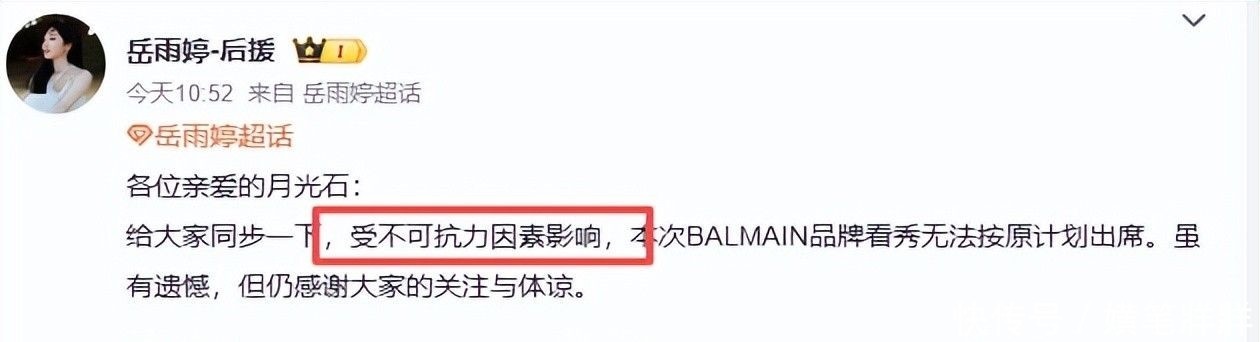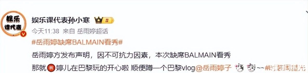 3月4日大秀开场前两小时,岳雨婷官方后援会微博紧急发布一则简短声明,称因“不可抗力因素”导致无法如期参与BALMAIN本季大秀,全文未披露任何具体缘由,亦未附带品牌方出具的正式邀请函或合作确认文件。